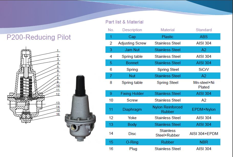 P200 is a pressure-reducing pilot which can help A200 maintain a preset downstream pressure, regardless of upstream pressure or flow rate fluctuation.